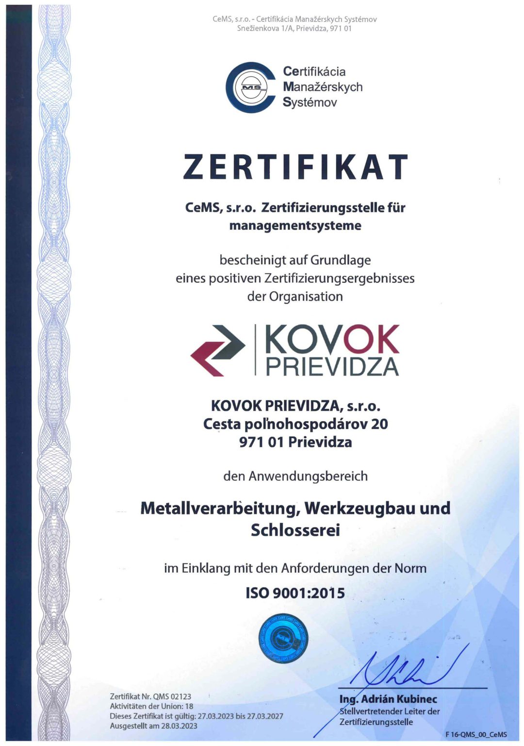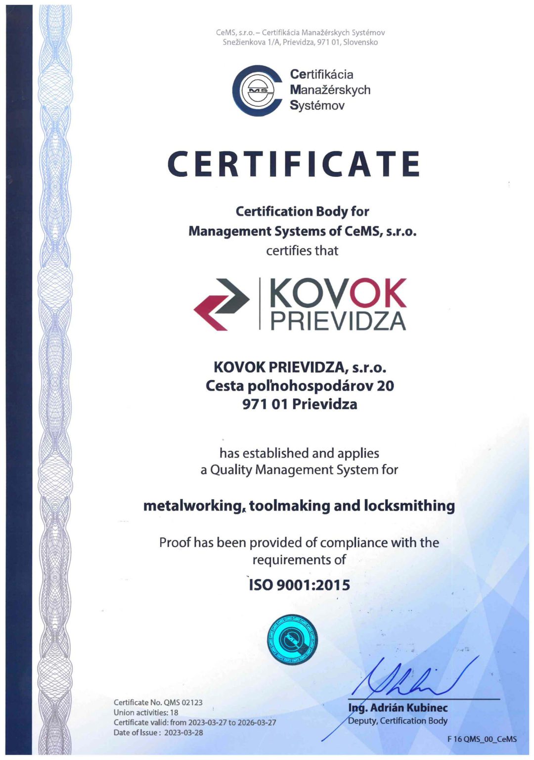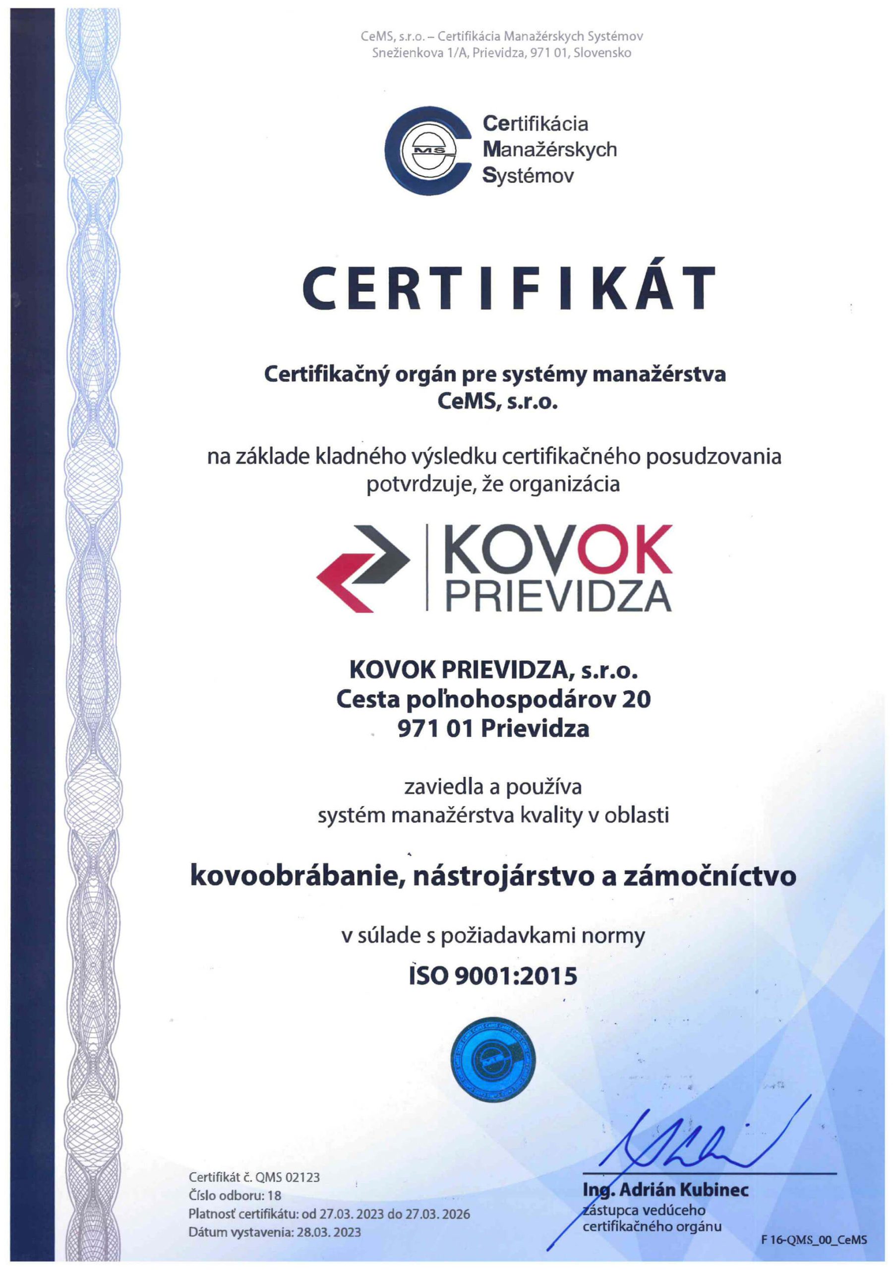 KOVOK Prievidza s.r.o. je držiteľom certifikátu normy ČSN EN ISO 9001:2015.