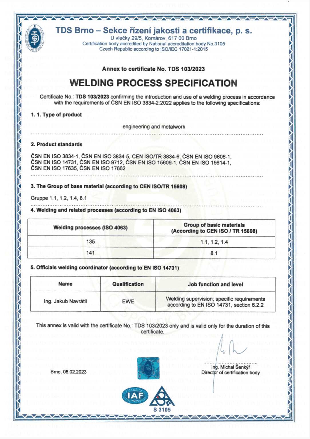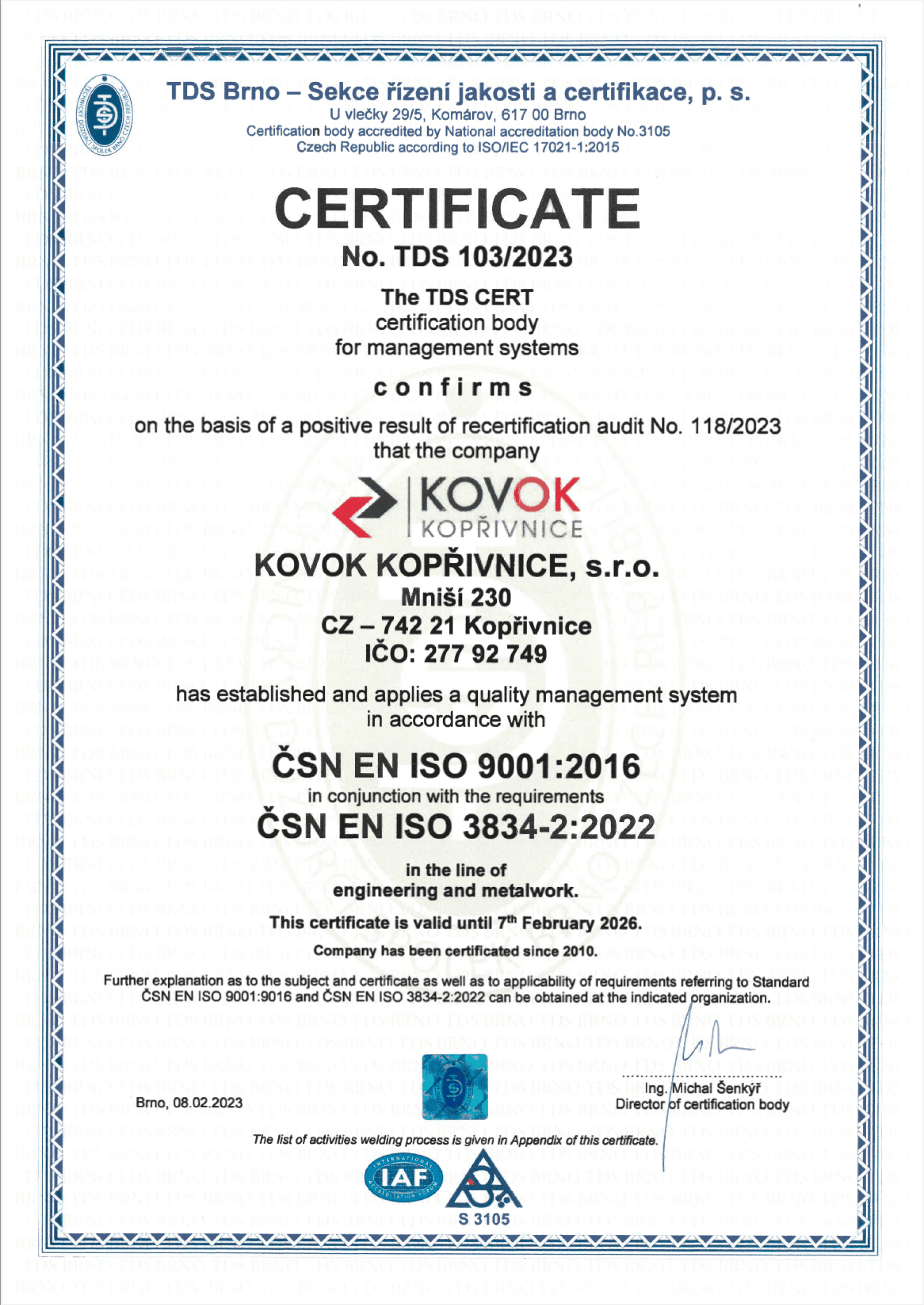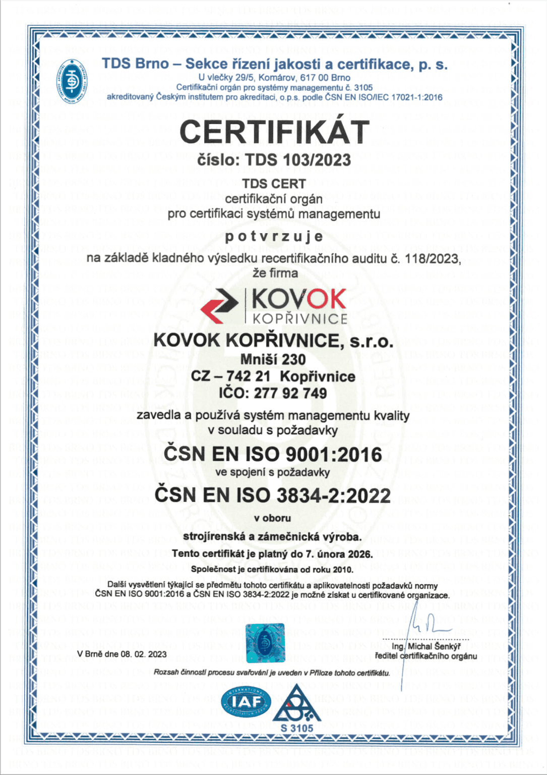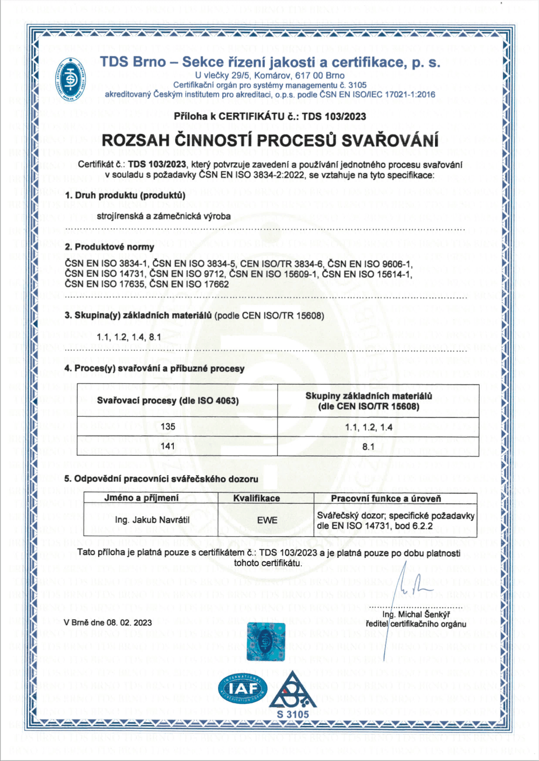 ČSN EN ISO 9001:2016; ČSN EN ISO 3834-2:2022