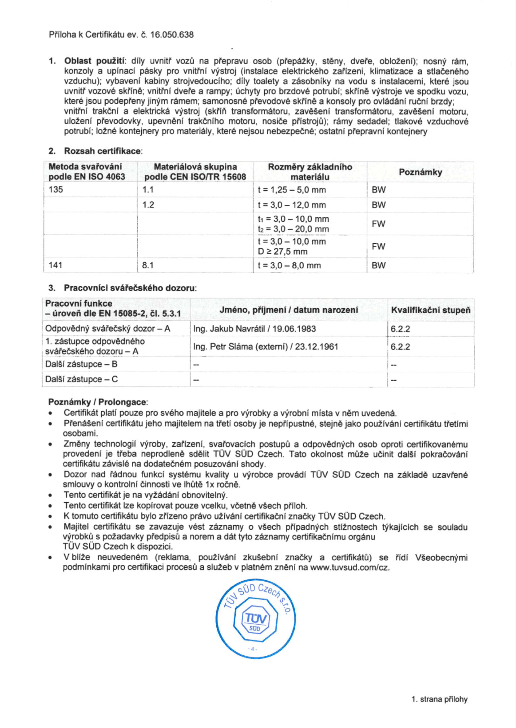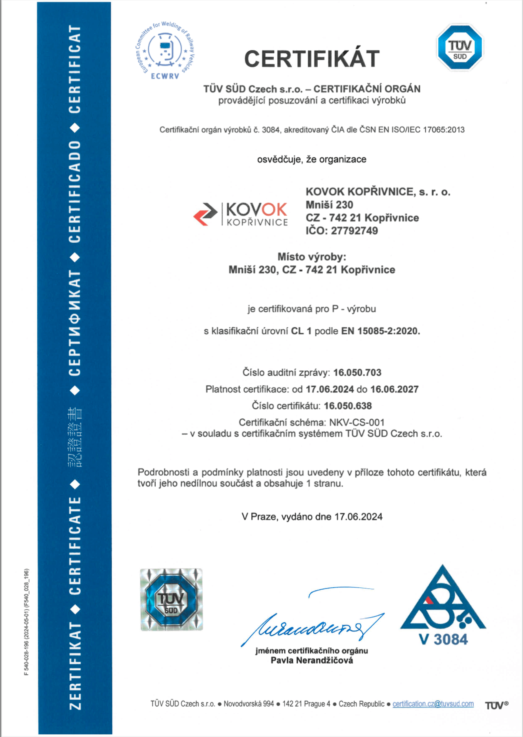 KOVOK Kopřivnice s.r.o. je držitelom certifikátov normy kvality, zvárania a zvárania pre obor koľajových vozidiel.